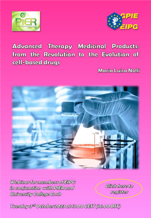 Θα θέλαμε να σας ενημερώσουμε για το online σεμινάριο της EIPG σε συνεργασία με το Πανεπιστήμιο του Cork και την Ιρλανδική Ένωση Φαρμακοποιών (PIER) με τίτλο: ”Προηγμένα Φαρμακευτικά Προϊόντα Θεραπείας: από την Επανάσταση στην Εξέλιξη των φαρμάκων που βασίζονται σε κύτταρα” που θα πραγματοποιηθεί την Τρίτη 3 Οκτωβρίου 2023 και ώρα 17.00 CEST(16.00 BST), Ομιλητής: Maria Luisa Nolli