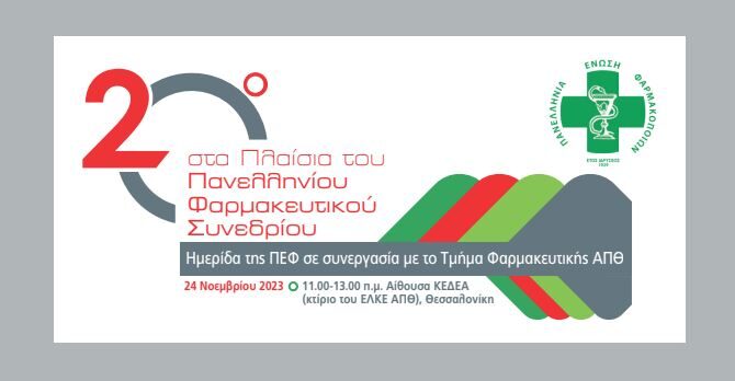Θα θέλαμε να σας ενημερώσουμε για την προ-συνεδριακή Ημερίδα της ΠΕΦ σε συνεργασία με το Τμήμα Φαρμακευτικής Αριστοτελείου Πανεπιστημίου Θεσσαλονίκης (ΑΠΘ) , που θα πραγματοποιηθεί την Παρασκευή 24 Νοεμβρίου 2023 και ώρα 11:00-13:00, στο αμφιθέατρο Ι του ΚΕΔΕΑ (κτίριο επιτροπής ερευνών, διεύθυνση: 3ης Σεπτεμβρίου Πανεπιστημιούπολη, Θεσσαλονίκη 546 36) στο πλαίσιο του 20ου Πανελληνίου Φαρμακευτικού Συνεδρίου της ΠΕΦ.